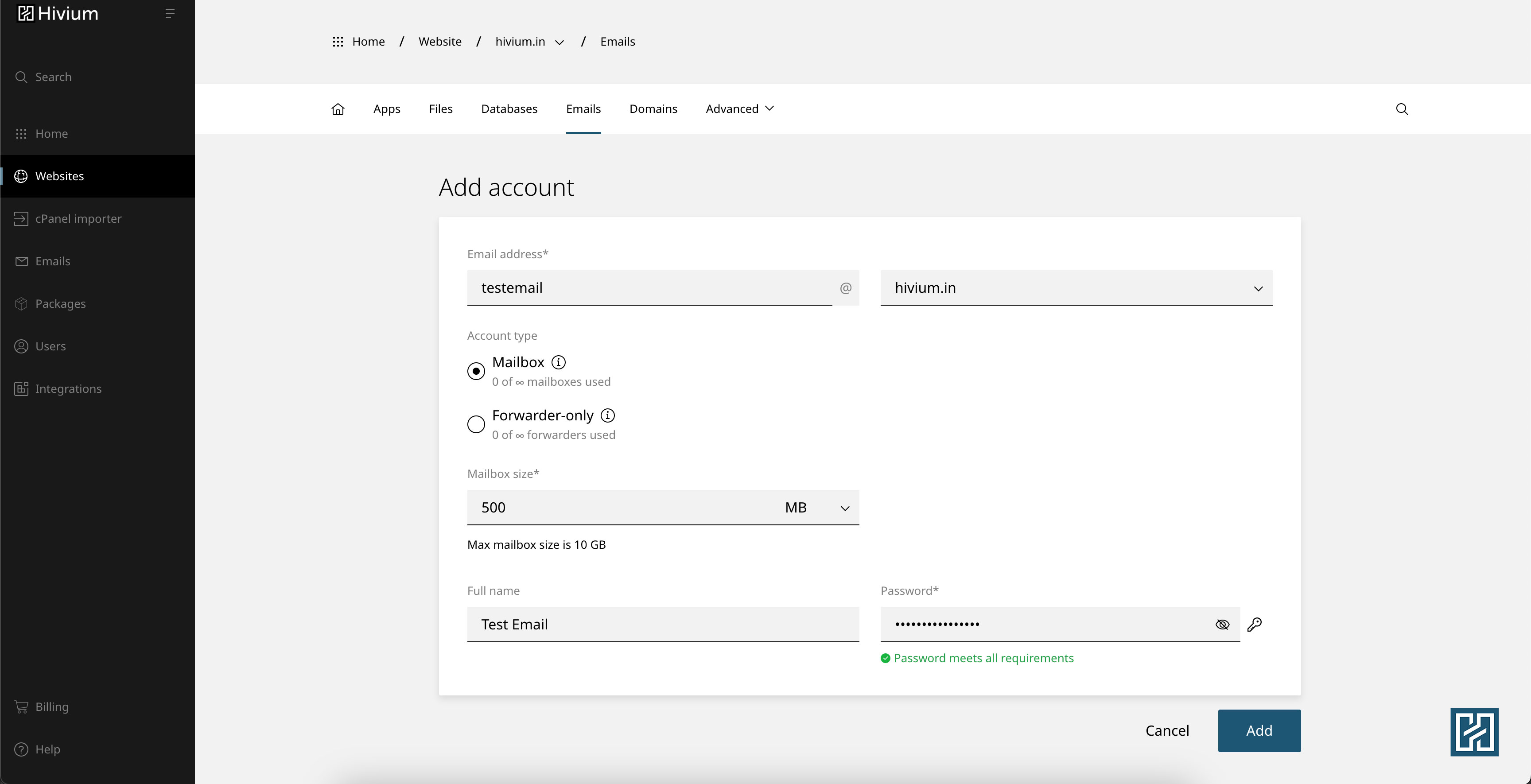 5. Once everything looks good to you, click on the add button. Make sure that you have saved your password. You now have an email account of your choice.
