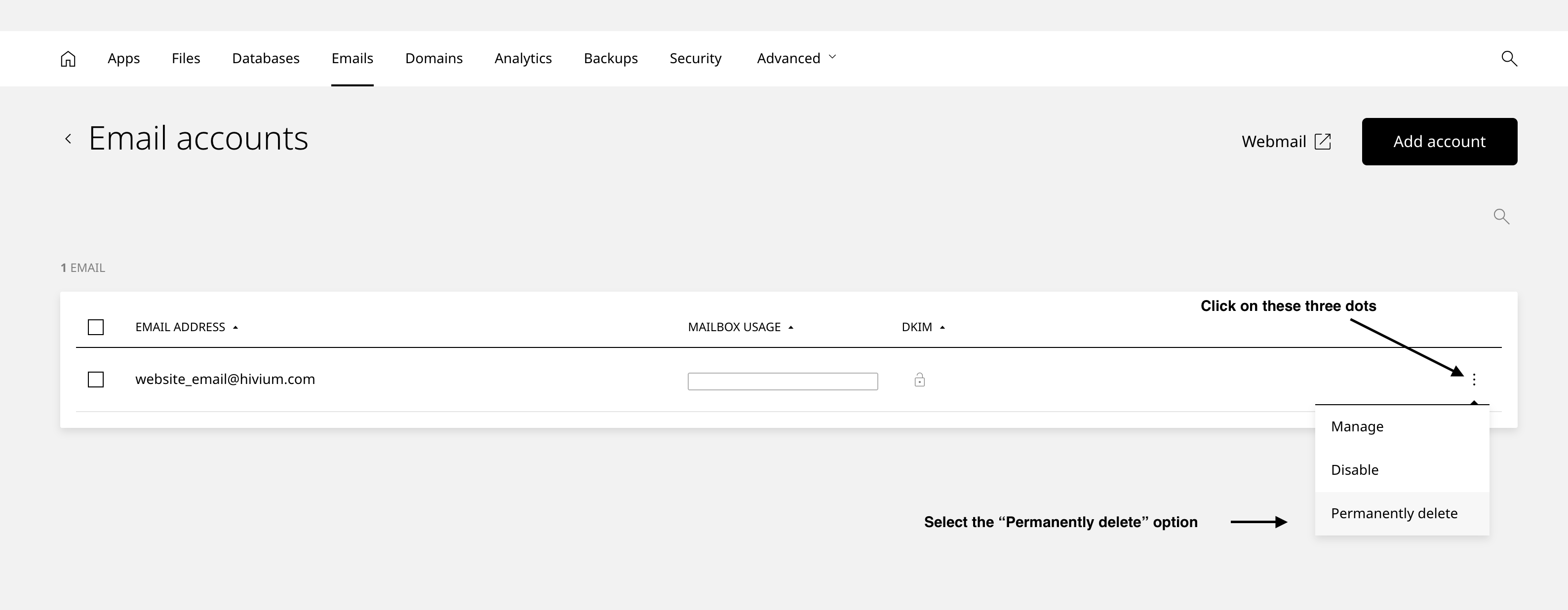 How to delete an email account in Enhance Control Panel?