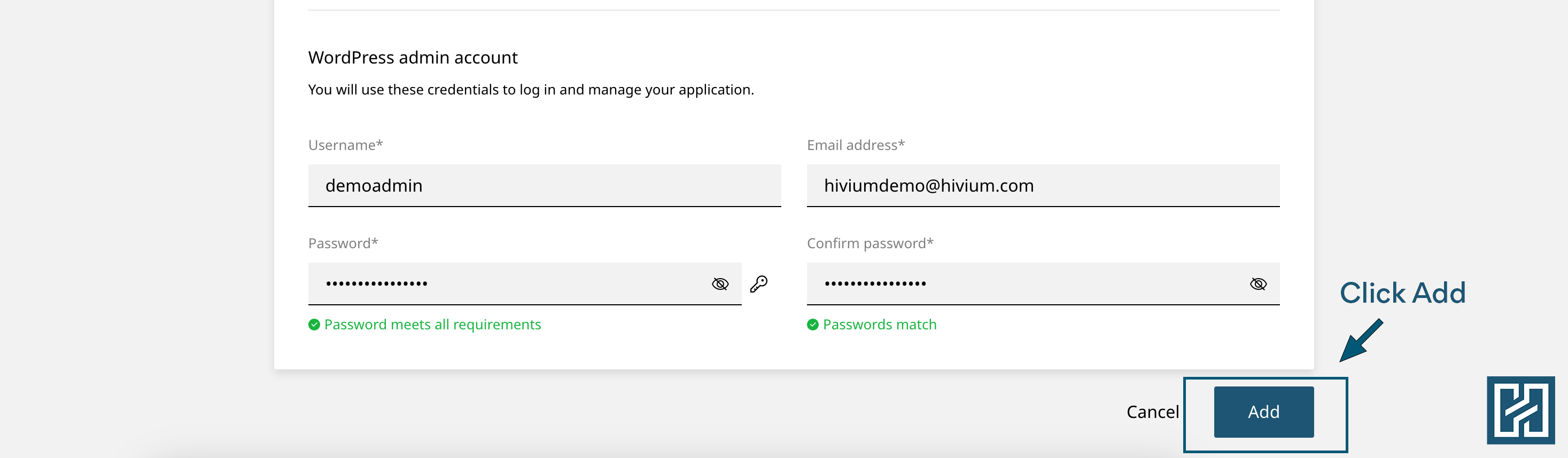 5. Once you have entered all the fields click on the Add button and WordPress will be installed for you.