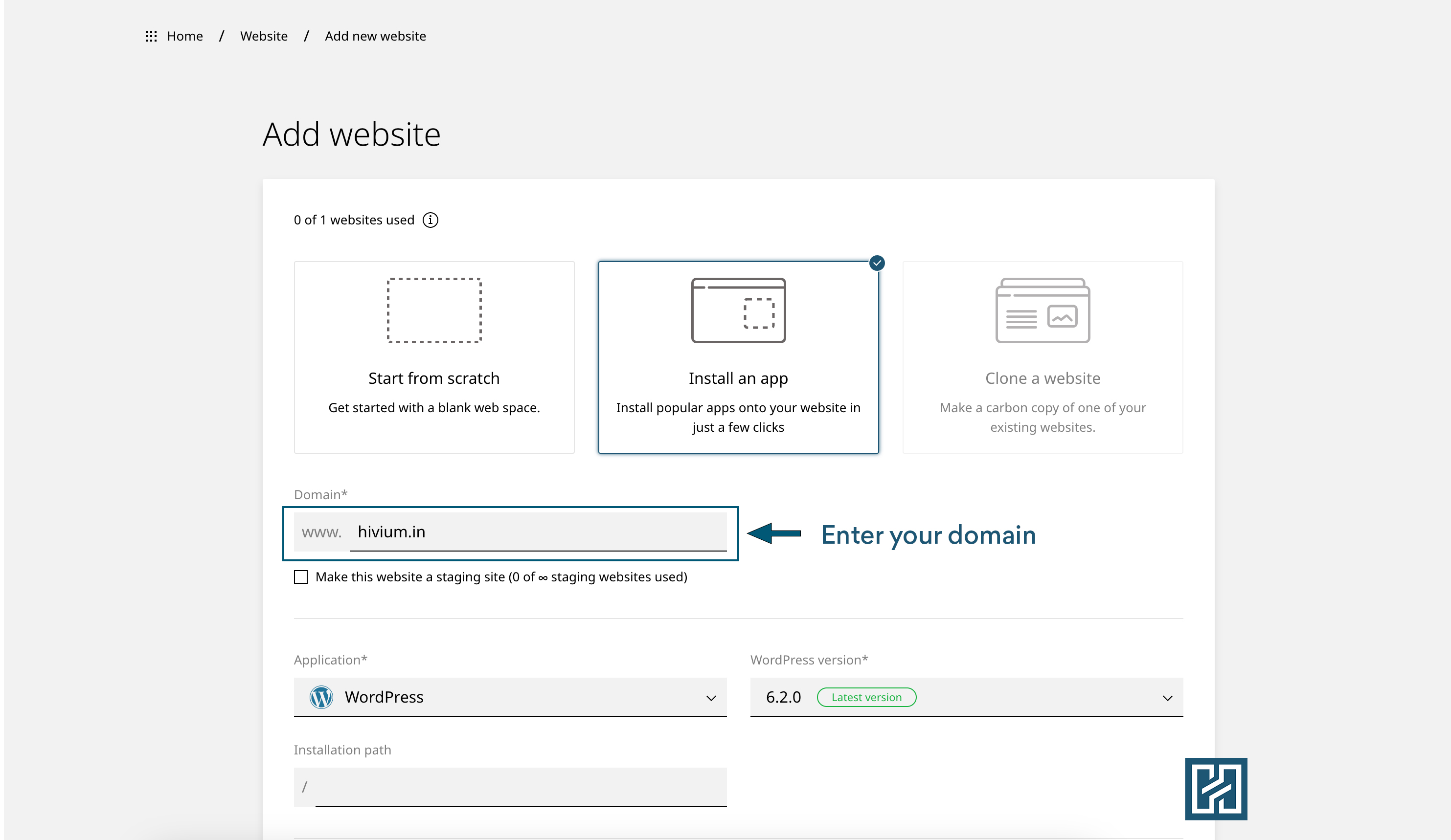 entered "hivium.in", or you can select the domain from the dropdown.