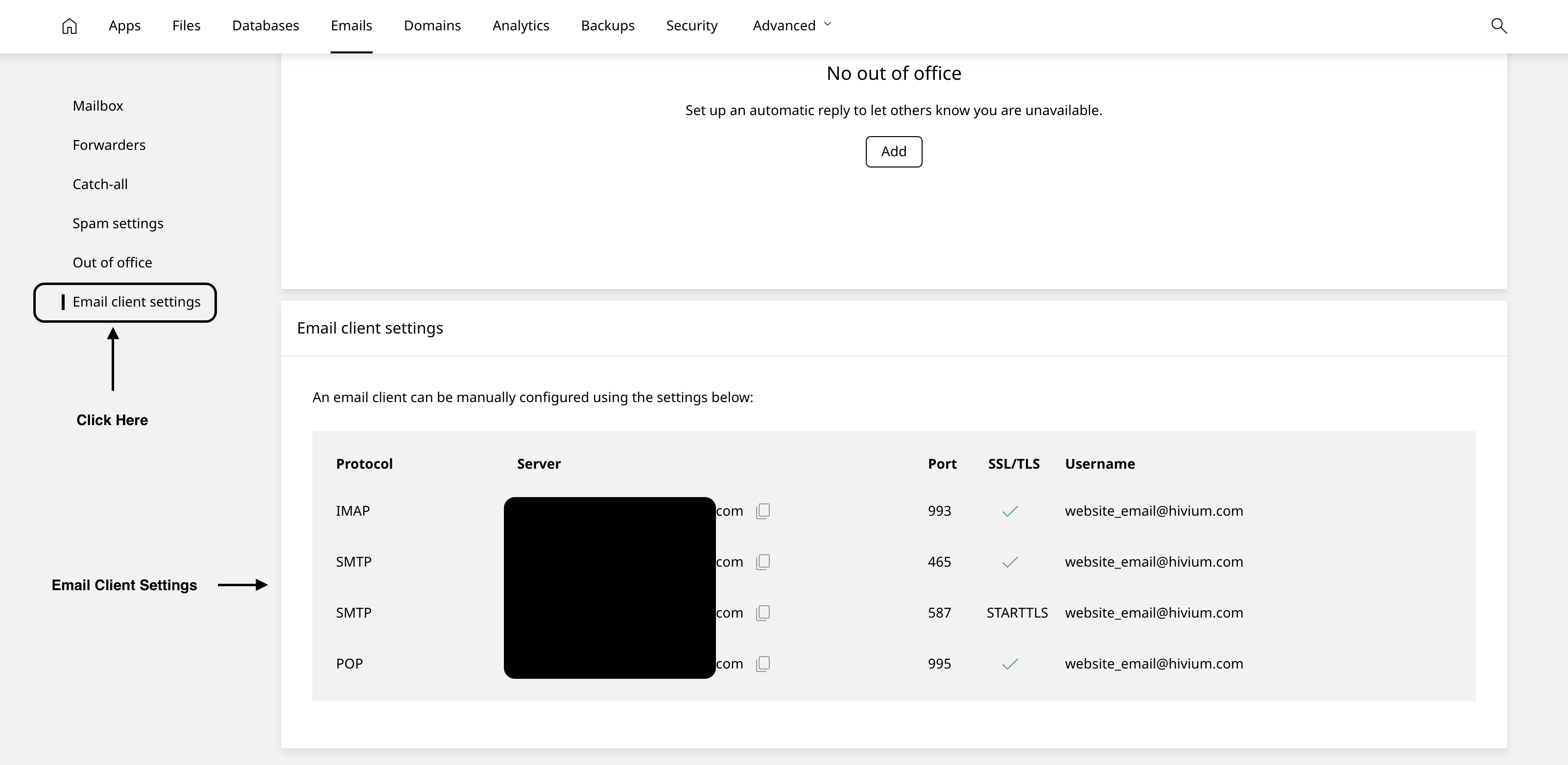 5. Enter all the details in your email application and your email should start working. We have blurred the server name in the screenshot below, but you should be able to see it.